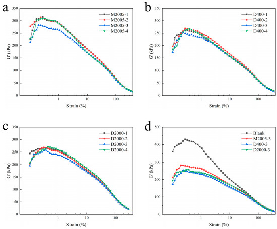 (a–c) Storage modulus (G′)–strain curves of composites with M2005, D400, and D2000 at loadings of 1–4 phr; (d) presents the storage modulus (G′)–strain curves of composites containing 3 phr of the three types of amino-terminated poly(propylene oxide).