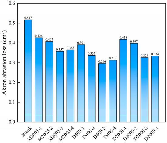 Tensile tests were conducted at room temperature using a universal testing machine on carbon black/natural rubber composites containing 1 phr to 4 phr of the three types of amino-terminated poly(propylene oxide). The specific test data are summarized in Table 3. As the content of amino-terminated poly(propylene oxide) increased from 0 to 3 phr, the tensile strength, 100% modulus, and 300% modulus of the composites exhibited an increasing trend, while the elongation at break showed a decreasing trend. These changes can be attributed to the enhanced interfacial interaction between carbon black particles and natural rubber chains facilitated by the amino-terminated poly(propylene oxide). During the tensile deformation of the composite material, the rubber chains experience greater resistance when sliding over the surface of carbon black particles, leading to an increase in both strength and modulus while reducing the elongation at break [28,29]. However, when the content of amino-terminated poly(propylene oxide) increases to 4 phr, both strength and modulus slightly decrease, which may be attributed to the excessive amount of amino-terminated poly(propylene oxide) exhibiting a plasticizing effect. Similarly, M-2005 and D-2000, due to their larger molecular size, exhibit a strong plasticizing effect, resulting in a lower hardness of the composite material compared to the control sample. Among the three types of amino-terminated poly(propylene oxide), the D400-based composite exhibits higher strength and modulus than the M2005-based and D2000-based composites. This is because the di-amino-terminated D400 provides more binding sites with carbon black, leading to stronger interfacial interactions between carbon black and natural rubber in the D400 composite. In contrast, although D2000 is also di-amino-terminated, its larger molecular weight results in partial compatibility with natural rubber, preventing some D2000 from interacting with carbon black. The wear resistance of the composite material can be evaluated using Akron abrasion testing. The samples were tested at room temperature using an Akron abrasion tester, and the Akron abrasion loss of carbon black/natural rubber composites with different types and contents of amino-terminated poly(propylene oxide) is shown in Figure 3. As the content of the three types of amino-terminated poly(propylene oxide) increased from 1 phr to 3 phr, the wear resistance of the carbon black/natural rubber composites improved, likely due to the enhanced dispersion of carbon black within the composite. However, when the amino-terminated poly(propylene oxide) content reached 4 phr, the wear resistance of the composite deteriorated. This trend is consistent with the variations in tensile strength and modulus, as these mechanical properties influence the wear resistance of rubber composites [30].