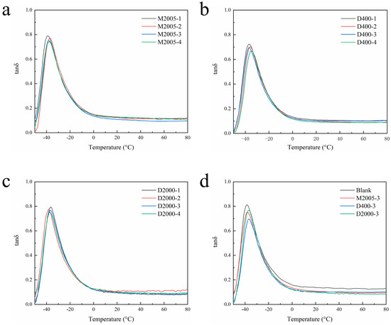 (a–c) Tan δ–temperature curves of composites containing 1–4 phr of M2005, D400, and D2000. (d) Tan δ–temperature curves of composites with 3 phr of the three types of amino-terminated poly(propylene oxide).
