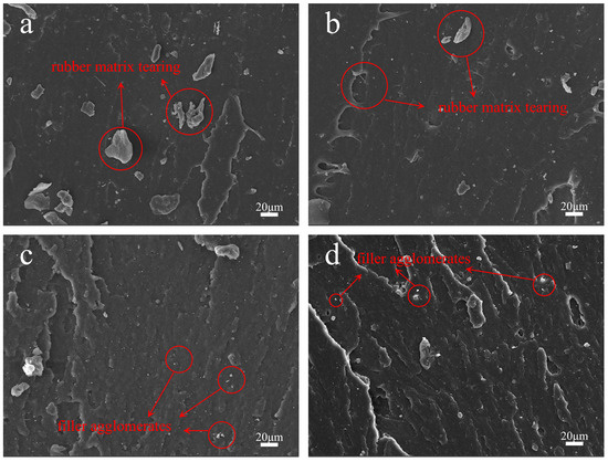 We prepared natural rubber composites with different carbon black and silica ratios and observed the tensile fracture cross-sections using SEM. The obtained images are shown in Figure 5. It can be seen that the agglomerates of both silica and carbon black are minimal in the four mixed-filler composites, indicating good dispersion of both fillers. Since amino-terminated poly(propylene oxide) can interact with the surface groups of both silica and carbon black, enhancing their compatibility with natural rubber, and Si-69 can also assist in improving the dispersion of silica; the fillers in composites with high silica content still exhibit good dispersion.