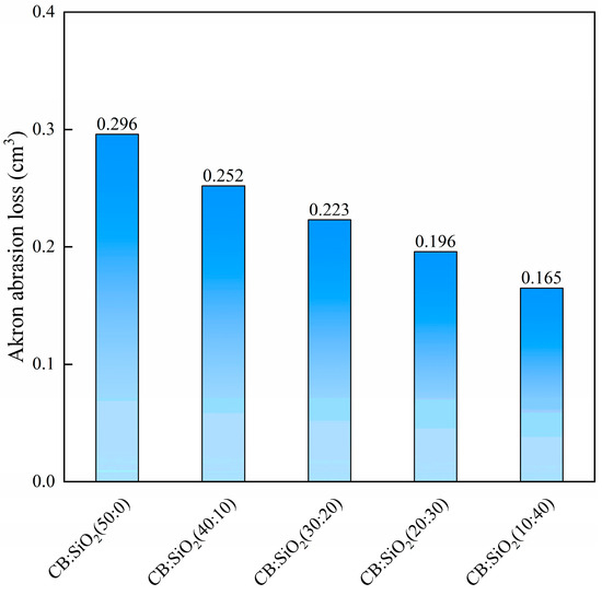 We prepared natural rubber composites with different carbon black-to-silica ratios incorporating D400 and measured their stress–strain curves. The detailed mechanical properties data are summarized in Table 4. As the silica content in the hybrid filler system increased, the composite’s strength, modulus, and hardness gradually decreased, while the elongation at break progressively increased. This can be attributed to the higher cohesive energy of silica particles, which makes them more prone to agglomeration in the natural rubber matrix. Consequently, silica exhibits lower reinforcing efficiency compared to carbon black; however, its contribution to elongation at break is greater than that of carbon black [16,36]. Under the influence of the dispersing agent, the strength and modulus of hybrid filler/natural rubber composites with silica content at or below 30 phr are superior to those of the control sample. The Akron abrasion resistance of hybrid filler/natural rubber composites with different silica-to-carbon black ratios is shown in Figure 6. As the silica content increases, the wear resistance of the composites improves, which is contrary to the trend observed in strength and modulus. Through multiple observations during the testing process, we found that when the grinding wheel interacts with the hybrid filler samples, the increased resilience of the hybrid filler/natural rubber composites may cause the grinding wheel to be pushed away, thereby reducing the effective abrasion time and leading to lower Akron abrasion loss.