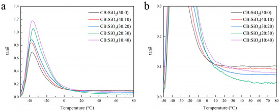 (a) Tan δ–temperature curves of hybrid filler/natural rubber composites with different silica-to-carbon black ratios. (b) Magnified view of (a).