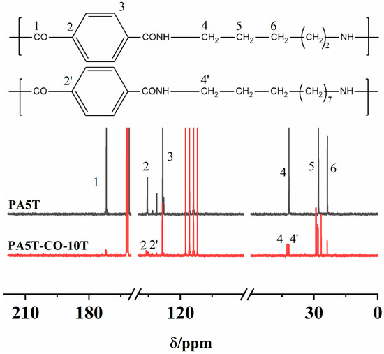 The 13C-NMR spectra of PA5T and PA5T-CO-10T are shown in Figure 1. The peak near 170.98 ppm could be attributed to the carbon atom on the carbonyl group (position 1). The chemical shift near 134.70 ppm is caused by the carbon atom on the benzene ring connected to the carbonyl group (position 2). The peak at approximately 127.53 ppm corresponds to the carbon atom at position 3 of the benzene ring. The peaks at 40.98 ppm (position 4) and within the range of 22.85–27.08 ppm (positions 5–6) originate from the proton signals of carbon atoms on the methylene group connected to the amide group N atom and the carbon atoms on the remaining methylene groups, respectively. Interestingly, it could be discovered that PA5T-CO-10T exhibits additional peaks at positions 2′ and 4′ compared to PA5T, which is attributed to the irregular copolymerization of PA5T and PA10T [25]. The aforementioned peak positions align with the theoretical peak positions of PA5T and PA5T-CO-10T, thereby verifying the chemical structures of PA5T and PA5T-CO-10T [26].