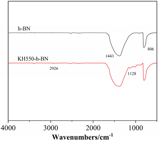 Figure 2 displays the infrared spectra of h-BH and h-BH treated with the silane coupling agent (KH550-BN) [27]. The characteristic peaks at 1443 cm−1 and 806 cm−1 correspond to the stretching vibration absorption peak and the bending vibration peak of BN, respectively [28]. As indicated in Figure 2, the spectrum of KH550-BN exhibits additional peaks at 1128 and 2926 cm−1 compared to that of h-BH, which correspond to the Si-O-Si asymmetric stretching vibration peak and the stretching vibration absorption peak of the methylene group on the silane coupling agent after binding with h-BH, respectively, indicating that KH550 was successfully grafted onto BN after hydrolysis [29].