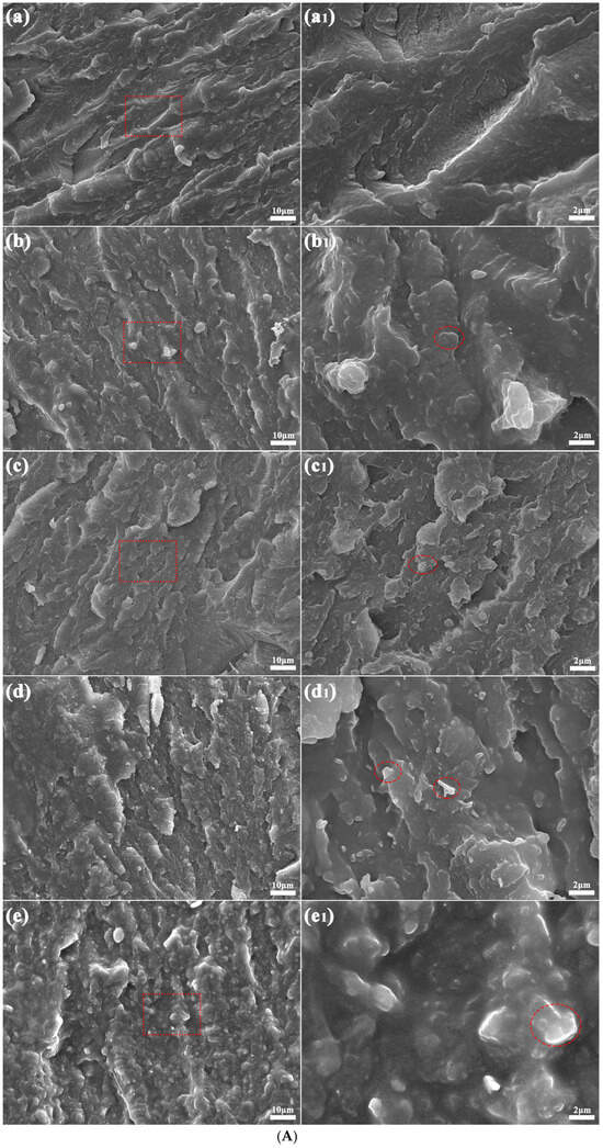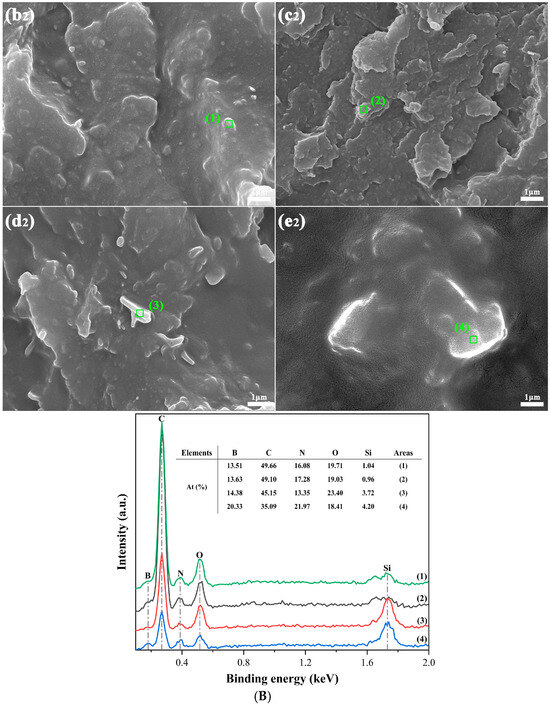 (A) SEM graphs of PA5T-CO-10T/BN composites with different h-BN contents. (B) EDS analysis of PA5T-CO-10T/BN composites with different h-BN contents (×10,000). (a,a1): pure PA5T-CO-10T; (b,b1,b2): PA5T-CO-10T/5% BN; (c,c1,c2): PA5T-CO-10T/10% BN; (d,d1,d2): PA5T-CO-10T/20% BN; (e,e1,e2): PA5T-CO-10T/30% BN.