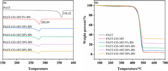 Figure 4a,b present the DSC and TG curves of PA5T, PA5T-CO-10T, and PA5T-CO-10T/BN, respectively. As shown in Figure 4a, the melting temperature of PA5T-CO-10T (280.09 °C) is significantly lower than that of PA5T (358.42 °C), which is attributed to the introduction of PA10T segments reducing the rigidity and regularity of the molecular chains. Meanwhile, it can be observed that the addition of h-BN does not significantly affect the melting temperature of the material. Notably, the melting temperatures of both PA5T-CO-10T and PA5T-CO-10T/BN are above 275 °C, fully meeting the industry’s requirements for heat-resistant materials [25,32]. As depicted in Figure 4b, the TG curves of PA5T and PA5T-CO-10T almost overlap, indicating that their initial thermal decomposition temperatures are nearly identical [5]. This similarity arises from their comparable chemical compositions, both belonging to the polyamide system, leading them to exhibit similar basic characteristics in terms of thermal stability. Compared with PA5T, both PA5T-CO-10T and PA5T-CO-10T/BN exhibit a wider processing window (greater than 90 °C; the initial thermal decomposition temperature minus the melting temperature).