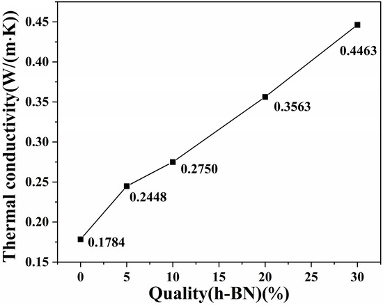 Figure 5 illustrates the thermal conductivity of the PA5T-CO-10T/BN composites with varying h-BN contents. As indicated in Figure 5, the thermal conductivity of pure PA5T-CO-10T resin is relatively low, only reaching 0.1784 W·m−1·K−1. With the increase in the h-BN content, the thermal conductivity of the PA5T-CO-10T/BN composites generally exhibits a relatively rapid growth rate. Specifically, when the h-BN filling amount is 30 wt%, the thermal conductivity of the composite reaches 0.446 W·m−1·K−1, which is 2.5 times that of the pure PA5T-CO-10T resin, reaching the level reported in the relevant literature [33,34]. This is due to the fact that, according to the SEM analysis, h-BN demonstrates excellent dispersion and interfacial bonding within the matrix resin. Consequently, with the increase in the content of h-BN, which possesses good thermal conductivity, it becomes easier to form thermally conductive pathways among the matrix resins [35]. These factors collectively provide a guarantee for the continuous and effective enhancement of the thermal conductivity of PA5T-CO-10T.