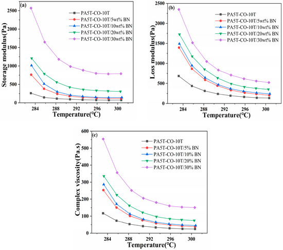 The trends of the storage modulus, loss modulus and complex viscosity of the PA5T-CO-10T/BN composites with varying h-BN contents as a function of temperature are shown in Figure 6a–c, respectively. As can be seen in Figure 6a, the storage modulus of the PA5T-CO-10T/BN composites with different h-BN contents decreases as the temperature increases, until it stabilizes at a certain value. This is due to the gradual melting of the matrix resin as the temperature rises, making the material more susceptible to deformation under stress, thus leading to a gradual decrease in its storage modulus [36]. When the resin is fully melted, the value of the storage modulus becomes relatively stable. It can also be observed from the figure that the storage modulus of the material exhibits a gradual increase with the increase in the h-BN content. This is due to the higher rigidity of h-BN compared to the matrix resin, and its incorporation enhances the mechanical stability of the material [37,38,39]. Furthermore, h-BN penetrates the amorphous part of the polymer, thereby enhancing the rigidity and strength of the polymer material. Simultaneously, the incorporation of h-BN promotes heterogeneous nucleation in the polymer, further improving the mechanical stability of the material [40,41]. These factors collectively lead to a gradual increase in the storage modulus of the PA5T-CO-10T/BN composite material as the h-BN content increases.