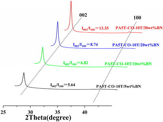 Figure 7 presents the X-ray diffraction spectra of the PA5T-CO-10T/BN composites with different h-BN contents. The diffraction peaks at 27.6° and 41.6° correspond to the (002) and (100) plane diffraction peaks of h-BN, respectively. The diffraction peak in the horizontal direction is represented by I002, and the diffraction peak in the vertical direction is represented by I100. The I002/I100 ratio is commonly used to indicate the degree of orientation. As depicted in Figure 7, when the content of h-BN ranges from 5 to 30 wt%, the I002/I100 ratio falls between 5.64 and 13.35. Most of the h-BN exhibits a high level of in-plane orientation, potentially due to the flow of the injected melt during processing. Additionally, Figure 7 reveals that as the h-BN content increases, the horizontal orientation of h-BN in the PA5T-CO-10T/BN composite gradually increases. This is attributed to the reduced degree of freedom in motion during shear flow with the increasing amount of h-BN added, leading to a more pronounced orientation structure of h-BN in the resulting composite, which also provides a guarantee for the continuous improvement of the material’s thermal conductivity [44,45]. This is consistent with the SEM analysis results presented in Section 3.3.