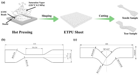 ETPU beads were made into sheets with a thickness of 5 mm by using the vapor hot press molding process, with the temperature of the vapor set at 120 °C and a pressure of 0.2 MPa. The complete process of sample preparation is shown in