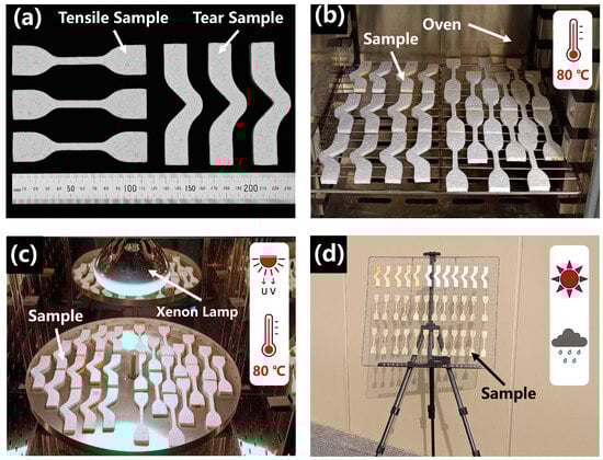 Figure 3d). The experimental site was located in Enshi, China (109.5103 E, 30.3004 N, and 430 m above sea level); the height of the samples from the ground was 1 m, and the angle of inclination formed between the horizontal plane of the samples and the ground was 45°; they were facing due south, so that the samples were exposed to the maximum amount of solar UV radiation. The experiment started on 17 July 2022 and ended on 24 July 2024; the specific state of the natural environment during the experiment is shown in