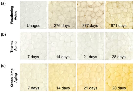 Figure 4b). In contrast, the surface of the samples showed very obvious changes after xenon lamp aging. After 14 days of the xenon lamp aging process, the degree of surface yellowing was similar to that after 671 days of weathering aging. After 28 days, the surface of the ETPU samples showed an amber color (