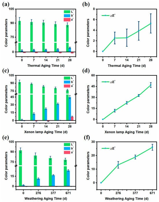 Figure 5c,d), nearly nine times that in thermal aging experiments, showing that the strong irradiation of xenon arc light could significantly accelerate the aging rate. In the weathering aging process, the trend of color parameter changes was similar to that of xenon lamp aging (