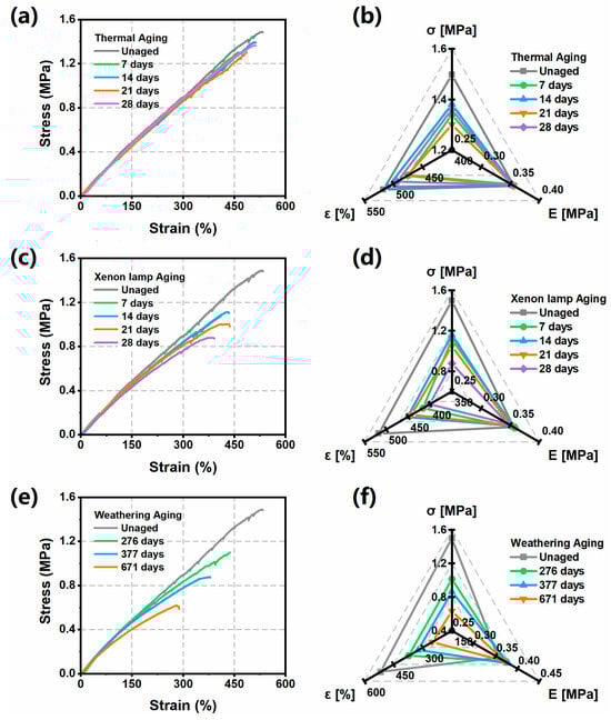 Figure 8a,b). This is attributed to the relatively stable chemical chain structure of the polyurethane, and 80 °C is not enough to cause significant changes in the chemical bonds and degradation of the material. Moreover, a crosslinking reaction occurs in the material at the early stage of aging, and with the continuation of time, the crosslinking reaction will be balanced with the chain segment breakage, which ultimately keeps the mechanical properties of the material in a relatively stable state. In contrast, after UV irradiation, the mechanical properties of the ETPU showed a very obvious decline (
