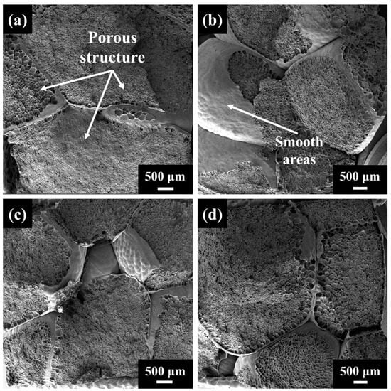 Figure 9a), which is due to the fact that the ETPU beads tear directly from the middle area when subjected to axial tensile force and show the porous structure inside the beads. The middle region of the beads is the perfect fracture location, where the beads are subjected to the maximum tensile force, and at this time, the mechanical strength of the material is at its optimal state. Therefore, for unaged samples, the boundary area between the beads is not a defective part of the ETPU. With the weathering aging experiments carried out, smooth areas gradually appeared in the ETPU fracture surface (