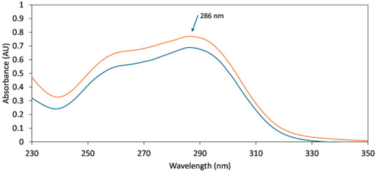 UV spectroscopic studies were conducted to demonstrate the incorporation of the active ingredient into the fibrous mats and to quantify its concentration. Representative overlaid UV spectra are displayed in Figure 5, indicating that the same absorbance maxima at 286 nm can be observed in both cases: standard solution and the sample solution prepared from the FEN loaded HP-β-CD fibers. Furthermore, the quantitative results indicated loading efficiency values close to 100% (average loading efficiency = 97.2%), with a low standard deviation, indicating a homogenous dispersion of the active substance in the fibers (Table 1).