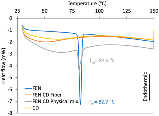 To track the physical changes that occur during the electrospinning process, thermoanalytical studies using DSC were performed. The DSC thermograms of the individual components (FEN and HP-β-CD), the physical mixture of the components, and the obtained nanofibers were recorded and can be observed in Figure 6. The physical mixture of FEN and HP-β-CD was prepared in such a way that the FEN content matched with the FEN content of the FEN-loaded HP-β-CD fibers.