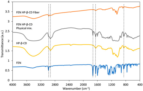 The FT-IR analysis was performed to investigate the interaction between the FEN and HP-β-CD. The FT-IR spectra of FEN, HP-β-CD, their physical mixture, and the FEN-loaded HP-β-CD fibers are shown in Figure 7. The spectra of the individual samples were shifted vertically for better representation. Characteristic peaks are presented with vertical dashed lines.