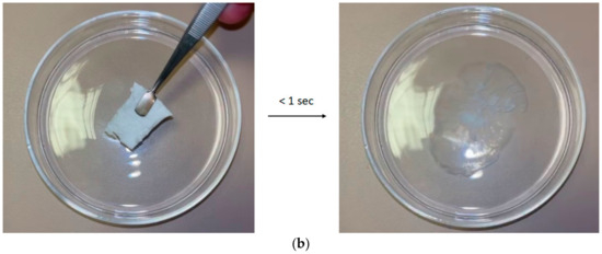 Disintegration tests were conducted both in a simulated moist tongue environment, using a filter paper wetted with artificial saliva, as well as in water. Upon contact with the wet filter paper (Figure 8a), the fibrous mats displayed spontaneous disintegration and liberation of the active substance. Similar characteristic was observed when the FEN-loaded HP-β-CD fiber mat was immersed in water (Figure 8b), where the disintegration occurred within 1 s. The rapid disintegration can be attributed to the combined effect of the high porosity and high surface-to-volume ratio of the fiber mat, the amorphous nature, and the high solubility of the CD derivative.