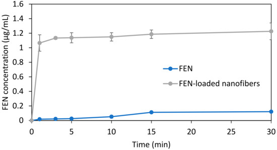 To assess the release of the active ingredient, a small-volume in vitro dissolution test was conducted using artificial saliva. The test was performed on both the active substance and the drug-loaded HP-β-CD fibers. The results of these tests are summarized in Figure 9. The active substance exhibited an exceptionally low solubility, with a negligible increase in concentration over time to 0.12 μg/mL. As demonstrated, the microfibrous formulation undergoes immediate disintegration upon contact with the aqueous environment and displays a burst release of the active substance, which rapidly plateaus from the first time points of 1.07 μg/mL to 1.22 μg/mL after 30 min. It is interesting to observe that at 1 min, FEN release is over 60 times higher from the microfibrous formulation, compared to the micronized active ingredient.