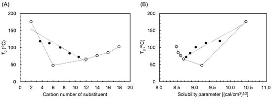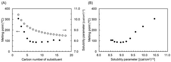 Appropriately adjusting physical properties such as thermal stability and mechanical strength is essential when considering alternatives to petroleum-derived plastics. Mixed esterification of cellulose with both short and long alkyl moieties is an effective strategy for tuning the physical properties of CEs over a broad range because these properties are significantly influenced by the introduced substituents and the degree of substitution (DS) [26,27,28,29,30,31]. Edgar et al. investigated MCEs involving the two substituents, acetyl and acyl (propyl, butyl, hexyl, or nonanoyl) groups, and found liner correlations between the solubility parameter (SP) and the Tg, logarithmic melt viscosity, or flexural modulus, drawing a conclusion that the properties of CE may be predicted with confidence without laboratory efforts [27]. The SP–physical property relationships established in the literature are indeed useful within the materials studied there. However, before extending the empirical relationship to any CEs, there is a serious question to address; as far as the melting points of a series of SCEs from other studies [22,23] are concerned, SCEs do not follow an empirical linear relationship involving SP (Figure 1).