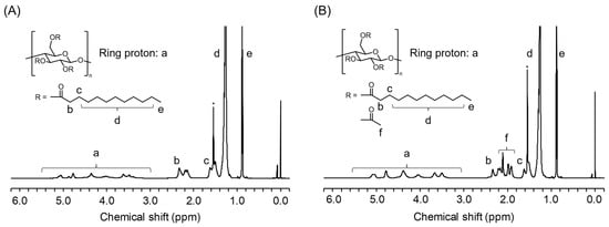 Table 1 enumerates representative samples of SCE and MCE systematically prepared in this study. The sample preparation was systematic in terms of the selection of acyl groups and substituent ratio of MCE. The preparation parameters were determined with reference to the literature [33,34,35,36,37,38,39]. The parameter settings for sample preparations were the same except for the type of acylation agent. As shown in Table 1, the total degree of substitution (DStotal) was 3.0 for the samples. The apparent weight-average degree of polymerization (DPw) expressed as the polystyrene standard decreased as the carbon number increased. Malm et al. reported that, for a series of SCEs with a similar absolute degree of polymerization, the apparent intrinsic viscosity (limiting viscosity number) decreases as the carbon number increases [41]. Therefore, the systematic difference in SCEs in apparent DPw observed in this study must be smaller or negligible if expressed in absolute DPw. The DS of the CEs was determined by 1H NMR spectroscopy. As an example, the NMR spectra of the CL3.0 (DSLa3.0) and CAL1.6 (DSLa1.6) are shown in Figure 2. The degree of substitution by the lauroyl group (DSLa) was determined from the peak observed at 0.8–1.0 ppm, corresponding to the terminal methyl group (Equation (1)). The degree of substitution by the acetyl group (DSAc) was calculated using Equation (2) because of the overlap of the acetyl peak (peak f in Figure 2B).