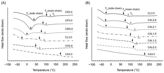 Figure 3 shows the second-heating DSC thermograms of the CEs. The thermograms display a broad glass transition for all of the CEs and, in some cases, one or two broad endothermic peaks (Tm and Tp). Among these thermal transitions, the low-temperature endothermic peaks (Tm) are associated with the melting of the acyl groups. Figure 3A shows that SCEs with C12 or a longer acyl chain exhibit a peak corresponding to the melting point of the aliphatic acid groups in the DSC thermogram, as previously reported [25]. For these SCEs, the highest Tm and largest ΔHm were observed for the stearoyl group, which had the longest alkyl chain, and as the carbon number decreased, the Tm shifted to lower values and the ΔHm decreased. In Figure 3B, the peaks of Tm were observed in the low-temperature regions of CL3.0, CAL2.6, and CAL2.1. Furthermore, the ΔHm of these peaks tended to decrease with a reduction in the lauroyl substituent ratio, and the Tm was absent for CAL1.6. The disappearance of the Tm observed for the CALs suggests that the crystallization of lauroyl groups is inhibited by modification with acetyl groups. The Tp is an endothermic peak observed at a temperature higher than the Tg by approximately ~40 °C, which has not been attributed to any type of transition in this study. Similar endothermic peaks were reported for similar CEs in previous studies, but in our view, the origin of such endothermic peaks is still controversial; Glasser et al. reported that they were melting points [26], while Yamagishi et al. and Tanaka et al. independently reported that they could be a transition from an anisotropic to isotropic phase [29,44]. The Tp must be some kind of a transition but could not be attributed to either the melting point or anisotropic-to-isotropic-phase transition in our study. The Tg values of CEs were influenced by the DS and the carbon number of the acyl group. Previous studies have indicated that a higher DS or a longer acyl chain (up to around C7) lowers the Tg [45,46], whereas acyl chains with C12 or more carbon atoms slightly increase the Tg due to crystallization interactions between the acyl groups [25]. For the CALs, Tg values were observed between CA3.0 and CL3.0, with an interpolative trend in which increasing the lauroyl substituent ratio led to a decrease in the Tg of the CALs.