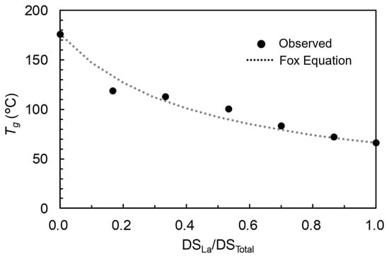 We also examined whether the Tg and mechanical properties of CALs could be predicted from other methods using a model equation based only on the physical properties of the corresponding SCEs, CA3.0 and CL3.0 without using the SP. For Tg, empirical evidence suggests that the experimental Tg values of copolymers are typically in good agreement with the Fox equation [50,51,52]. In the case of CEs, the Tg of cellulose acetate with external plasticizers and partially substituted SCEs with long acyl chains as internal plasticizers aligns well with the Tg calculated by the Fox equation for a mixture of cellulose acetate and an external plasticizer or unsubstituted cellulose and eicosane (C20 alkane) [53,54,55]. Considering the CALs as copolymers of CA3.0 and CL3.0, we compared the Tg values calculated using the Fox equation with the experimental values. Figure 6 shows the experimental Tg (data points) and calculated Tg (dashed line) as a function of the lauroyl substituent ratios. The calculated values were obtained from the Fox equation (Equation (3)) using the Tg values (TgCA3.0, TgCL3.0) of CA3.0 and CL3.0, with the weight fractions (wCA3.0, wCL3.0) corresponding to the substituent ratios of the acetyl and lauroyl groups in each CAL.