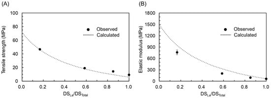 Observed and calculated mechanical properties of CL3.0 and the CALs. (A) Tensile strength as a function of the lauroyl substituent ratios. Dotted lines represent the values of the CALs calculated from the values of cellulose triacetate and cellulose trilaurate in Malm et al. [22]. (B) Elastic modulus as a function of the lauroyl substituent ratios. Dotted lines represent the values of the CALs calculated from the values of cellulose triacetate in the handbook [59] and cellulose trilaurate in this work.