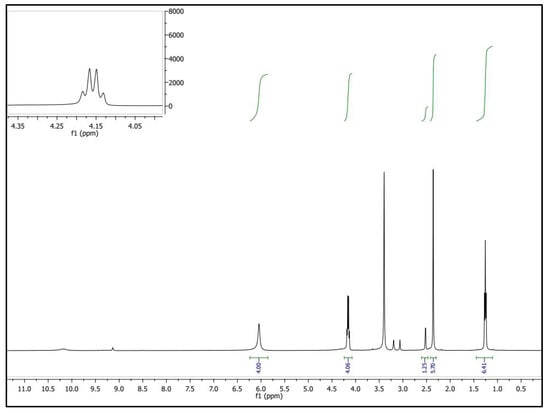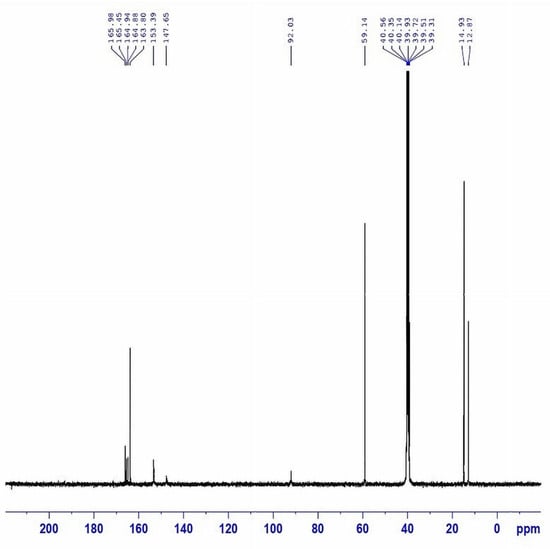 Step A: A mixture of malonohydrazide (0.1 mmol) and ethyl 2-cyano-3,3-bis(methylthio)acrylate (0.2 mmol) was refluxed in 20 mL of methanol for 2 h. The formed precipitate was filtered off, dried, and crystallized from methanol to afford the pure bis-pyrazole product (MPy, Scheme 1A) as faint brown crystals (yield = 85%, mp = 180–182 °C). IR (KBr) νmax (cm−1): 3446 and 3335 (NH2), 1721 (C=O ester), 1657 (C=O amide and C=N in the pyrazole rings), 1593 and 1532 (C=C in the pyrazole rings), 947 and 852 (C-S) as shown in Figure 1. 1H-NMR (DMSO-d6) d (ppm) (Figure 2): 1.26 (t, J = 7.03 Hz, 6H, 2CH3 ester), 2.36 (s, 6H, 2SCH3), 3.3 (s, 2H, CH2), 4.13 (q, J = 7.01 Hz, 4H, 2CH2 of ester), 6.04 (s, 4H, 2NH2) and 13C-NMR (DMSO-d6) δ (ppm) (Figure 3): 11.87(-CH3, ester group), 14.93 (-CH3, -SMe), 59.14 (-CH2, ester), 92.03 (-CO-CH2-CO-, 147.65, 153.39, 163.8, 164.88, 164.94 (-C-SMe), 165.45, 165.98 (2 -C=O). MS (70 eV, EI, %), m/z = 487 (M+, 19), Anal. Calcd.: %C, 43.40; %H, 4.71; %N, 17.86; %S, 13.63 (470.52): Found: %C, 43.38; %H, 4.69; %N, 17.85; %S, 13.66.