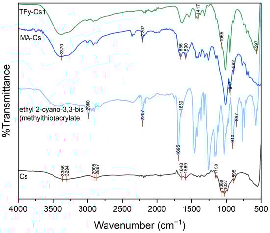 FTIR spectra of TPy-Cs1 derivative (Figure 5) showed the disappearance of the peaks of C-S groups at 947 and 892 cm−1, indicating the condensation between the -SMe groups of MA-Cs and the -NH2 groups of the thiocabohydrazide (TCH) with the elimination of MeSH (Scheme 2). The peak corresponding to CN groups at 2207 cm−1 also disappeared. Further, the absorption peak of the C=S group at 1065 cm−1 overlapped with that of the C–O group, obtaining a broad, strong peak. The absorption peaks related to N–C–S groups appeared at 1417 and 597 cm−1 [44].