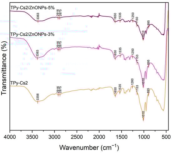 FTIR spectra of TPy-Cs2/ZnONPs-3% and TPy-Cs2/ZnONPs-5%, as representative examples for the ZnONP biocomposites, (Figure 6), showed absorption peaks comparable to those of their parent TPy-Cs2. The peaks at around the wavenumber of 566 cm−1, which corresponded to the expected N-ZnO and O-ZnO bonds in these biocomposites, seemed to overlap with those of their parent TPy-Cs2 [45].