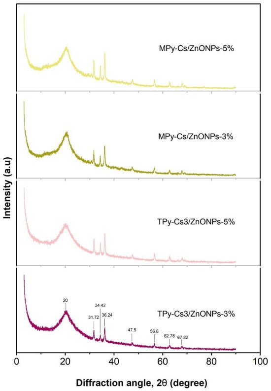 In order to confirm the incorporation of ZnONPs into the matrices of MPy-Cs and TPy-Cs, XRD measurements were performed (Figure 8). All the patterns of MPy-Cs/ZnONPs and TPy-Cs/ZnONP composites showed seven new peaks, beside the amorphous peak of MPy-Cs and TPy-Cs, near 2θ = 20°, at 2θ = 31.72°, 34.42°, 36.24°, 47.5°, 56.6°, 62.78° and 67.82°, which were indexed to crystal planes of (100), (002), (101), (102), (200), (201), and (202), respectively. These peak and their corresponding crystal planes are in good agreement with those for the pure ZnO according to the standard (JCPDS card no. 36-1451). The intensity of these peaks increased with increasing the ZnONP content in the composites. This evidences the successful preparation of the MPy-Cs/ZnONPs and TPy-Cs/ZnONP composites [47].