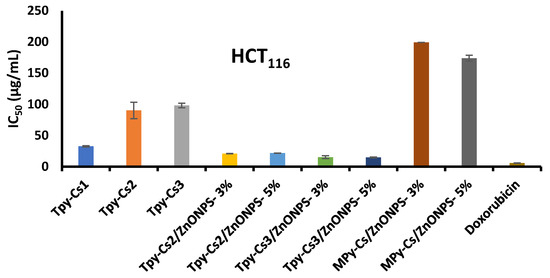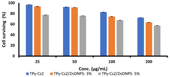 From the displayed results, it was concluded that the ideal concentration among all samples is 5% ZnONPs loaded into TPy-Cs3 (TPy-Cs3/ZnONPs-5%), as it exhibited the most potency against the three examined tumor cells.