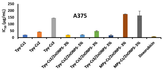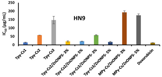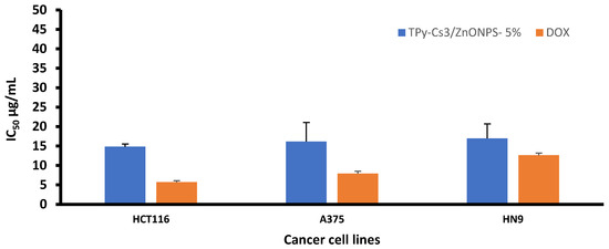 An analogous behavior was observed when ZnONPs were impregnated into the matrix of TPy-Cs3, since its IC50 value decreased from 98.07 to 15.21 and 14.82 μg/mL for TPy-Cs3/ZnONPs-3% and TPy-Cs3/ZnONPs-5%, respectively, against the HCT116 cell line (Figure 11 and Table 2). Again, its IC50 value reduced from 145.66 to 48.06 and 16.14 μg/mL for TPy-Cs3/ZnONPs-3% and TPy-Cs3/ZnONPs-5%, respectively, against A375 cell line (Figure 12 and Table 2). Also, its IC50 value decreased from 147.19 to 57.69 and 16.95 μg/mL for TPy-Cs3/ZnONPs-3% and TPy-Cs3/ZnONPs-5%, respectively, against the HN9 cell line (Figure 13 and Table 2). Thus, the TPy-Cs3/ZnONPs-5% was observed to be the most potent anticancer candidate against all the tested cell lines (Figure 14), although it does not exceed the anticancer activity of Doxorubicin.