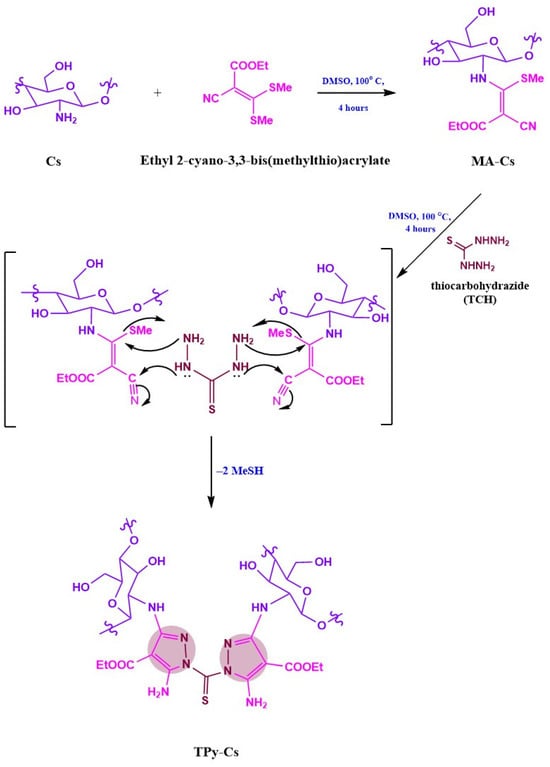 On the other hand, the synthesis of a novel series of TPy-Cs involved firstly the formation of the intermediate MA-Cs via treating equimolar amounts of chitosan with ethyl 2-cyano-3,3-bis(methylthio)acrylate in DMSO with stirring at 100 °C for 4 h (Scheme 2). Afterward, three different molar ratios of thiocarbohydrazide (TCH) were condensed with MA-Cs (1:2) in situ to afford a series of TPy-Cs derivatives denoted as TPy-Cs1, TPy-Cs2, and TPy-Cs3 (Scheme 2 and Table 1).