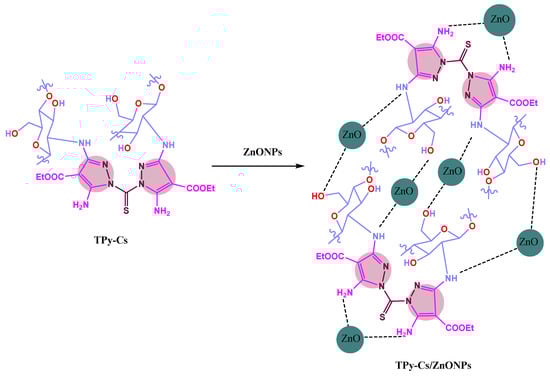 Using a mortar, two different precalculated quantities of ZnONPs were crushed separately with a fixed weight of either the Soxhlet-purified TPy-Cs2, TPy-Cs3, or MPy-Cs (0.25 g), then stirred in 10 mL of acetone for 24 h at room temperature. The ZnONP bio-composites were filtered and dried at 55 °C. The used ZnONP quantities were 3 and 5% based on the weight of the TPy-Cs and MPy-Cs derivatives. Thus, six composites, designated as TPy-Cs2/ZnONPs-3%, TPy-Cs2/ZnONPs-5%, TPy-Cs3/ZnONPs-3%, and TPy-Cs3/ZnONPs-5%, MPy-Cs/ZnONPs-3% and MPy-Cs/ZnONPs-5%, were produced. The interaction of TPy-Cs with ZnONPs in their composites, as a representative example, is shown in Scheme 3.