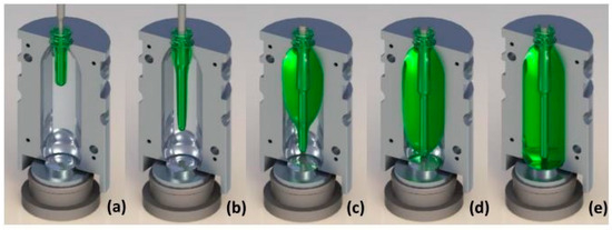 Stretch blow molding (SBM) is the most common method for producing polyethylene terephthalate (PET) bottles used in the carbonated soft drink (CSD) water and consumer product industries. The first step involves creating a preform, which is a test tube-shaped specimen made through injection molding. The preform is then heated above its glass transition temperature and shaped into a mold using both axial stretching through a stretch rod and radial stretching via internal air pressure. The typical evolution of the preform as it is stretched and blown in the mold is shown in Figure 1. Figure 1a depicts the beginning of SBM, Figure 1b represents the moment when the stretch rod is in touch with the preform, Figure 1c shows the geometry of the preform as low pressure air (~5 bar) is introduced (known as preblow). Figure 1d,e represent the introduction of high pressure air (~>30 bar) know as final blow which forms the details of the bottle.