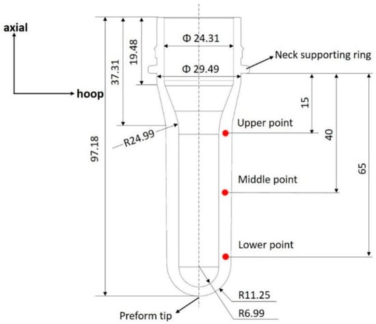 The supplied PET material has an intrinsic viscosity of 0.81 ± 0.02 dL/g and a density of 1.33 g/cm3 and was provided by DAK Americas for use in the current work. Further details on the material are available in a previous work by the authors [7,8]. The drawing of the preform is shown in Figure 2 with all dimensions in millimeters. The bottle design dimensions are provided by Procter & Gamble and represent one of the preform sizes utilized in industrial manufacturing. Consequently, this study also employs preforms of identical dimensions for experimentation.