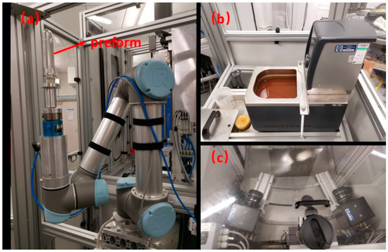 The robotic controlled test rig: (a) the robotic arm used to hold the specimen; (b) the oil bath device; (c) high-speed cameras used for monitoring the deformation.