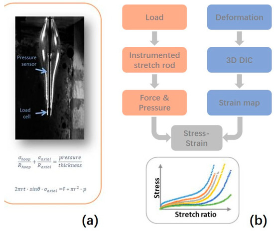 The rig is instrumented with a pressure sensor and load cell in the stretch rod [23] which records the internal pressure and axial force on the stretch rod over time as the preform is blown (Figure 4a). Digital image correlation (DIC) then produces a full-field strain map of the deforming surface of the preform whilst the pressure and force data can be converted to stress using thin-walled membrane theory [24]. With the help of the stretch rod device and the 3D DIC technology, the stress–strain/stretch ratio data for every point on the preform can be calculated (Figure 4b).