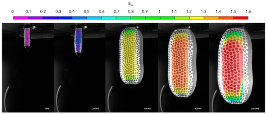 Example of evolution of blowing preform monitored by high-speed camera with contours of hoop strain as calculated by digital image correlation.