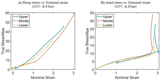 An example of hoop stress strain curves (a) and axial stress strain curves (b) from three positions of the preform (upper, middle, and lower as indicated in Figure 2).