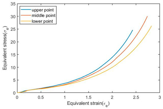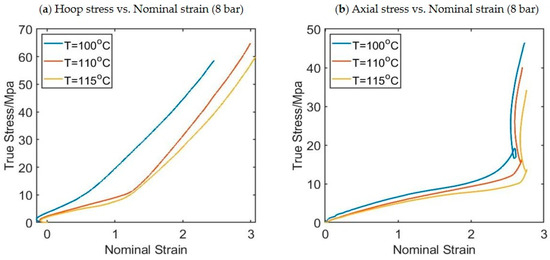 Stress–strain curves are available for every pixel in the DIC analysis, providing hundreds of stress strain curves for each process condition. In each free-flow experiment, 85 strain–stress curves are selected from the experiments corresponding to different pixels and they will be used as a training database for the model to be developed. Figure 7 shows an example of the stress–strain curves produced at three different locations along the length of the preform for a preform blown at 115 °C and a pressure of 8 bar, thus highlighting the influence of strain history/deformation mode on material behavior. The three locations are known as the upper point, middle point, and lower point. The three positions on the preform are defined in Figure 2. An example of stress–strain curves in both the hoop direction (a) and axial direction (b) taken from the midpoint of the preform for different preform temperatures is shown in Figure 8. It is worth noting that all experiments were repeated three times and the values of stress and strain are the averages of these three experimental values.
