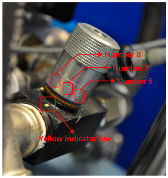 The mass flow rate of air was controlled by adjusting a flow restrictor valve, as shown in Figure 9. The flow restrictor valve has numbers engraved at its base, which, in conjunction with the yellow indicator line at the bottom, are used to quantitatively describe the degree of opening and closing of the flow restrictor valve.