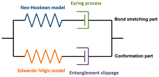 Menary et al. [26] compared several physical-based models, including a hyperelastic model, a creep model, and the Buckley model, to ascertain their suitability for modeling stretch blow molding. The model proposed by Buckley et al. [1,2,3] was found to provide the simulation results that match best with the experimental data. After Menary’s work, the model has evolved to capture key features of the behavior of PET including how the onset of strain hardening changed as a function of temperature and strain rate [4,5,27]. A 1D representation of the Buckley model is shown in Figure 10 which shows a parallel circuit with two arms, named the bond stretching part and the conformation part.