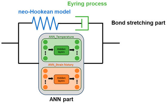 The ANN part of the model shown in Figure 11 is in parallel with the bond stretching part and operates independently. Therefore, the total stress () can be described by Equation (11):