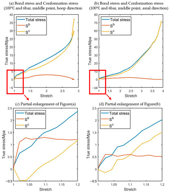 According to Figure 12c,d, it can be observed that Sb contributes significantly to the total stress at the beginning of deformation, particularly when the stretch is smaller than 1.02. However, with the development of stretching, the value of Sb decreases rapidly and approaches zero as the stretch increases and is subsequently dominated by the conformational part, as shown in Figure 12a,b. In the current work, the conformational part will be replaced by the ANNs.