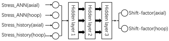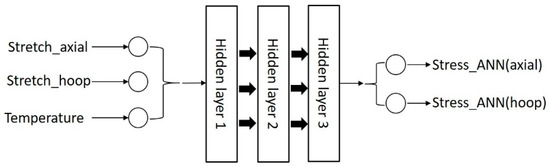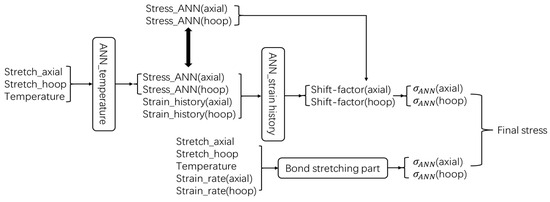 The inputs to the model are chosen to reflect the most important parameters that influence the behavior of the material. ‘Stretch_axial’ and ‘Stretch_hoop’ represent the principal stretches in the axial and hoop direction, respectively, whilst ‘Stress_ANN(axial)’ and ‘Stress_ANN(hoop)’ are the stresses predicted by ‘ANN_Temperature’ in the axial and hoop direction, respectively. Our previous work [7,8] has already demonstrated that one multilayer perceptron is able to accurately describe the relationship between strain, stress, and other variables; therefore, ‘ANN_Temperature’ also adopts a conventional architecture of a multilayer perceptron. The detailed transfer functions, weight matrices, and bias vector definitions were also explained in our previous work [7,8]. Note that strain rate is not an input parameter to this ‘ANN_Temperature’ component; so, the prediction from ‘ANN_Temperature’ is independent of this variable and is therefore the best fit prediction at the given temperature across all of the experiments conducted at different strain rates.