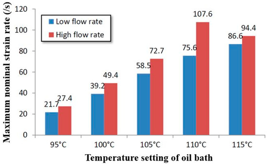 It has been demonstrated experimentally that strain rate has an important influence on the behavior of PET above Tg during biaxial tension experiments [1,3]. However, the influence of strain rate decreases in the SBM process. The strain rate during the SBM process is mainly influenced by the mass flow rate of air and the temperature of the preform. The maximum strain rate appearing in every free stretch blow test in Table 1 was recorded and is shown in Figure 14.